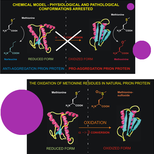 Prion disease is characterized by the α→β structural conversion of the cellular prion protein (PrPC) into the misfolded and aggregated “scrapie” (PrPSc) isoform. It has been speculated that methionine (Met) oxidation in PrPC may have a special role in this process, but has not been detailed and assigned individually to the 9 Met residues of full-length, recombinant human PrPC [rhPrPC(23-231)]. To better understand this oxidative event in PrP aggregation, the extent of periodate-induced Met oxidation was monitored by electrospray ionization-MS and correlated with aggregation propensity. Also, the Met residues were replaced with isosteric and chemically stable, nonoxidizable analogs, i.e., with the more hydrophobic norleucine (Nle) and the highly hydrophilic methoxinine (Mox). The Nle-rhPrPC variant is an α-helix rich protein (like Met-rhPrPC) resistant to oxidation that lacks the in vitro aggregation properties of the parent protein. Conversely, the Mox-rhPrPC variant is a β-sheet rich protein that features strong proaggregation behavior. In contrast to the parent Met-rhPrPC, the Nle/Mox-containing variants are not sensitive to periodate-induced in vitro aggregation. The experimental results fully support a direct correlation of the α→β secondary structure conversion in rhPrPC with the conformational preferences of Met/Nle/Mox residues. Accordingly, sporadic prion and other neurodegenerative diseases, as well as various aging processes, might also be caused by oxidative stress leading to Met oxidation.